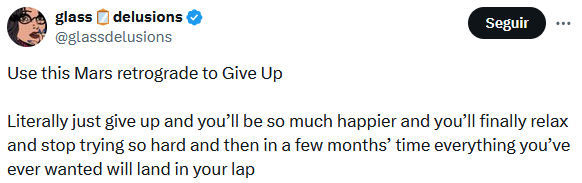Não consegui encaixar isto no texto, mas não queria deixar de mencionar. Para quem não está a par dos trânsitos astrológicos, estamos neste momento com um Marte Retrógrado em Leão - curiosamente, é o meu exacto posicionamento de Marte natal. Marte é, ainda hoje, um planeta que me é difícil de interpretar. O meu, então, mais difícil ainda, pois vem com retrogradação. Não consigo perceber NADA do que é suposto isto significar nem de que formas se manifesta na minha vida. Porém, como dizia, agora assim está no céu. E cruzei-me com esta dica:
