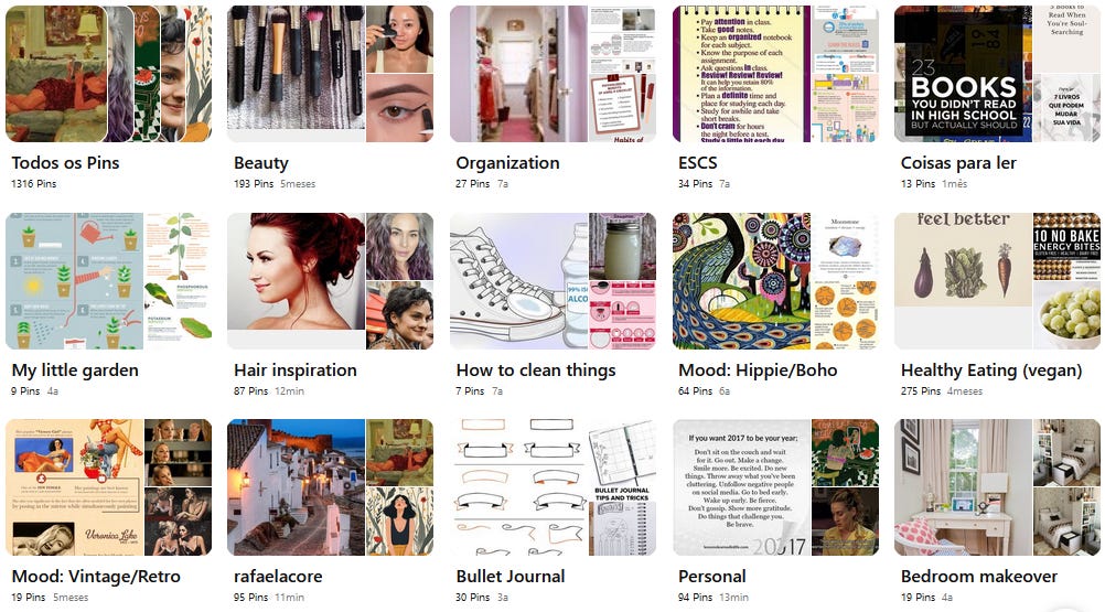 À semelhança do que acontece no e-mail, olhar para o meu arquivo do Pinterest foi como ver um relatório do meu crescimento e de todas as minhas fases. Entrar na faculdade e ter um álbum só com dicas de estudo. Quando me dá os entusiasmos súbitos por um artesanato específico e guardo para lá coisas que não volto a ver. A fase hippie ecofreak (não-praticante) que me levou a um álbum de receitas vegan, um de Yoga, e ainda a uma enchente de pins sobre produtos de skincare e cosméticos caseiros. Ou quando quis pintar o cabelo de vermelho e entrei num poço de investigação sobre tintas, como aclarar o cabelo de forma natural (lol), imagens e mais imagens de cabelos pintados de várias tonalidades de vermelho. Enfim, dá para perceber a coisa.