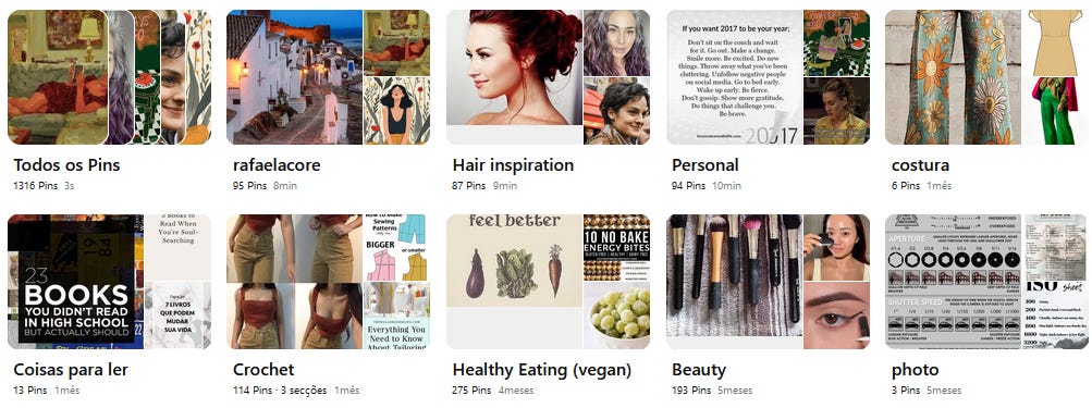 Por volta da mesma altura em que fiz a limpeza à minha caixa de e-mail também quis entrar no Pinterest e arrumar um bocado a coisa por lá. Inclusive tirei alguns prints para um rascunho de um texto, no qual acabei por só escrever uma frase e abandonar.