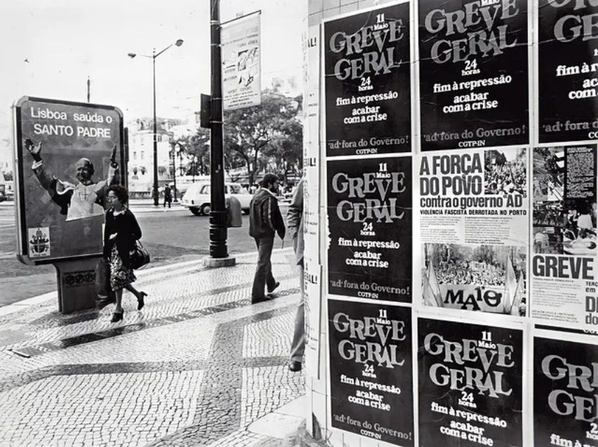 Encontrei essa foto há dias, no feed do Instagram, e acabei por partilhá-la nos stories. É uma foto da cidade de Lisboa onde se conseguem ver cartazes de convocação de uma Greve Geral, em protesto a um Governo AD. A foto é de 1982. Passados quarenta anos, cá estamos: em vésperas de uma greve geral, governados por um Governo da AD. Partilhei esta fotografia porque fiquei chocada com esta constatação visual de que vivemos em loop.1