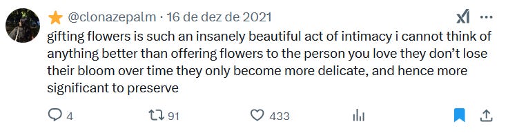 Volta e meia fica viral um tweet norte-americano sobre receber flores. Ou é uma mulher feliz porque o namorado actual lhe oferece flores; ou é uma mulher infeliz a fantasiar com o dia em que um namorado lhe ofereça flores; ou é outra mulher ainda a desabafar como o romantismo desapareceu porque os homens já não oferecem flores.